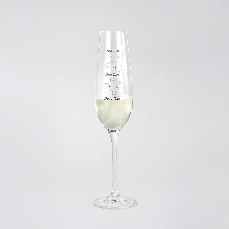 - Champagne glass with script print: ?Small Talk?, ?Deep Talk?, ?Dirty Talk? and illustration of rising bubbles.
