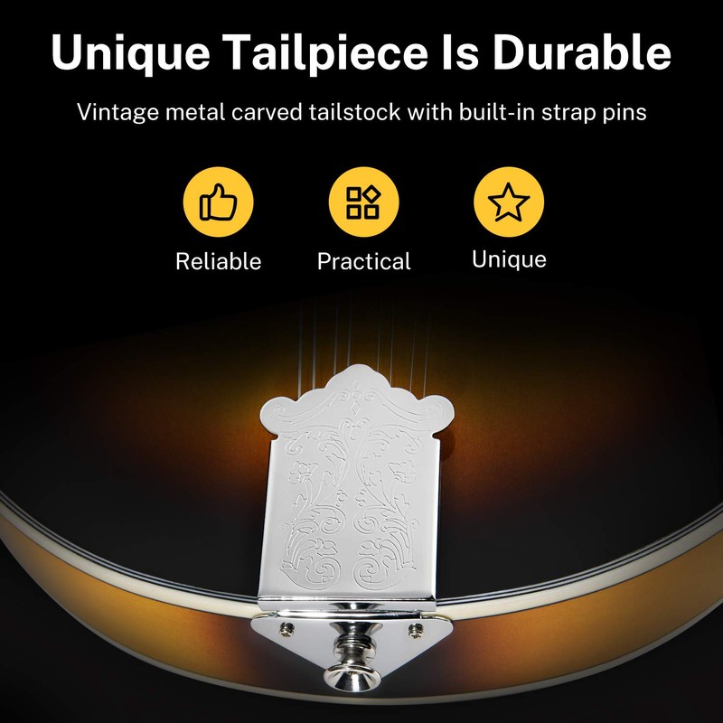 - 🎅🎄Solid Exquisite Craftsmanship: Chrome plated open gear tuners are easy to tune and keep mandolin playing in tune. Carved patterned tailpiece make mandolin more exquisite. Adjustable compensating bridge has metal knob and solid wood. Easy to adjust