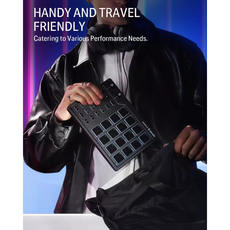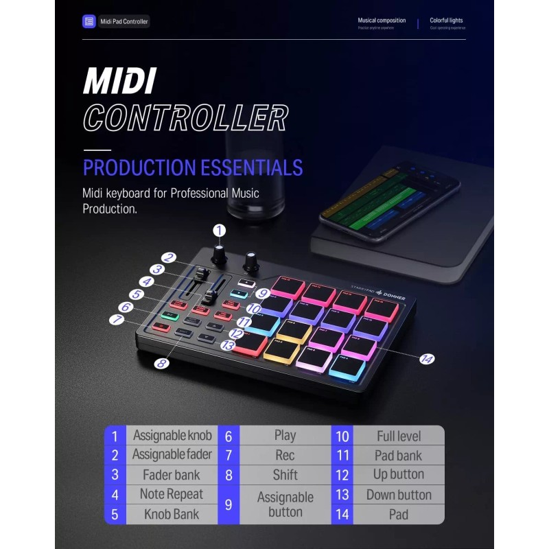- 【 16 Pad Controller with customizable lighting 】 The midi drum pad STARRYPAD's 16 soft silicone backlit pads can trigger drums, samples, effects and more. One button push allows you to quickly switch between 3 different pad banks for a total of 48 assignable pads. In addition, the beat maker STARRYPAD comes with adjustable velocity sensitivity curves. Perfect for all music makers.