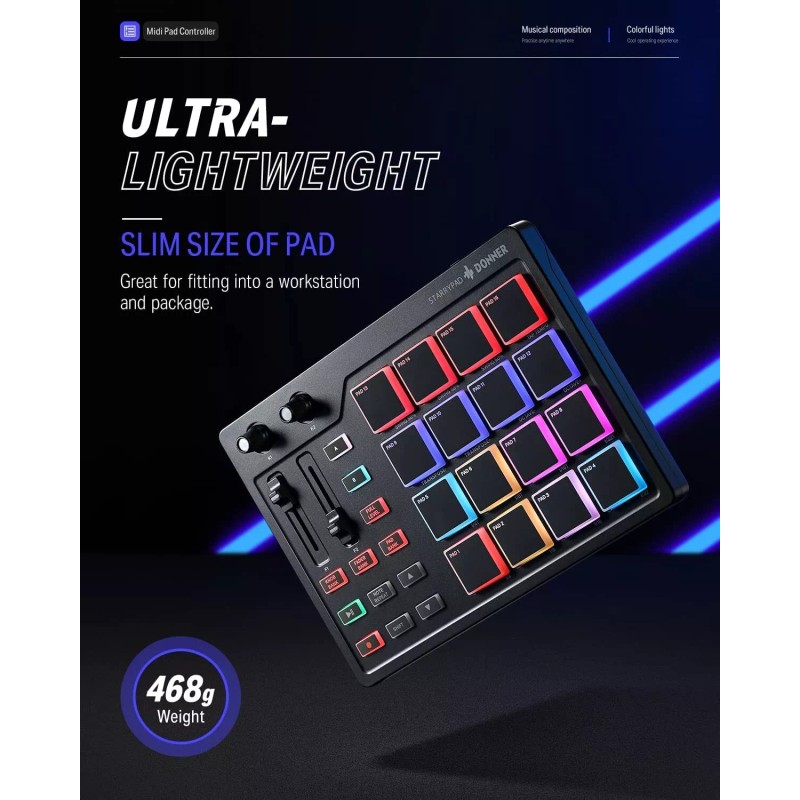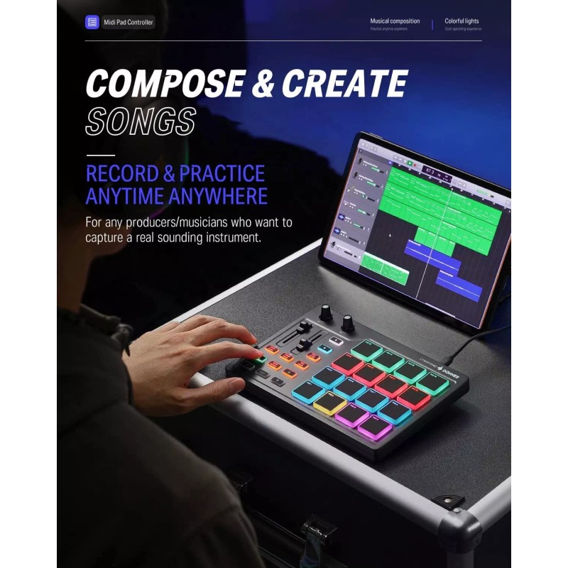 - 【 Customizable lighting 】The midi controller pad STARRYPAD backlit pad lighting with 7 vibrant colors. Helps you group your instruments with a visual reference.(Tips: the editor only can set this drum pad, doesn't have the function of recording and arranging music)