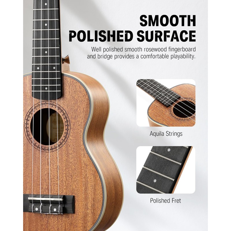 - Well Made Mahogany Craftsmanship: Smooth Mahogany body produces a crisp and pleasant sound. Highly polished smooth Aquila ukulele strings with elevated resistance to wear under tension. Well polished smooth rosewood fingerboard and bridge provides a comfortable playability. Sami-Open finish with 9-cycle grinding and polishing process.