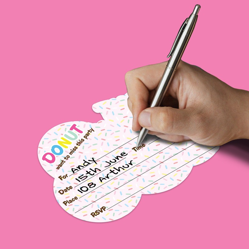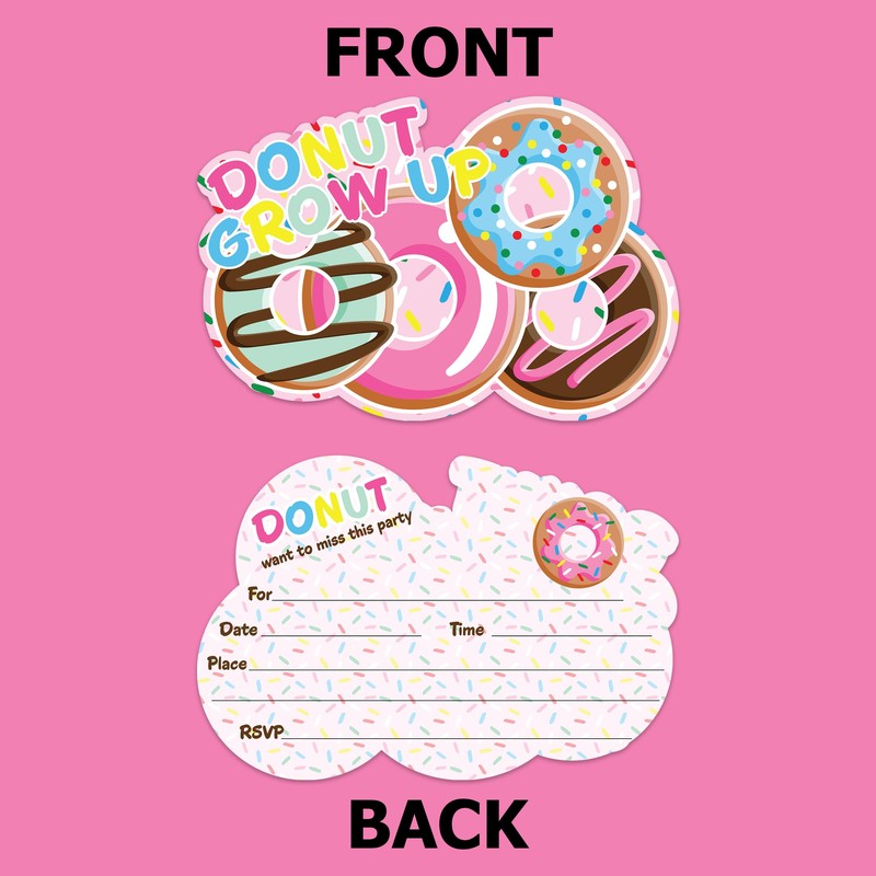 Donut Grow Up Doughnuts Birthday Party Invites For Boys and Girls - 20 Count of 4 x 6 Inch Double Sided Fill-In Invitations With Wet To Seal Envelopes