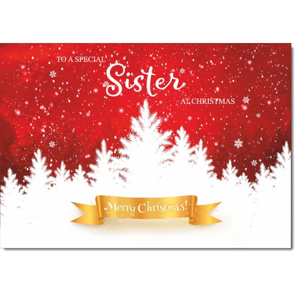 - DOODLECARDS ⭐ Sister Christmas Card White Forest with Red Sky Medium Size Christmas Card for Sister with Plain Envelope