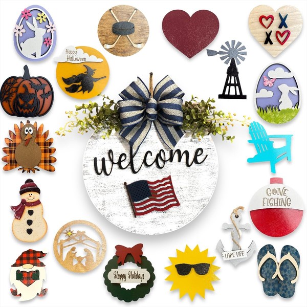 Door Hanger Sign Custom Wreath for Front Door Year Round Welcome Bow Decor + Interchangeable Season Changer Piece 14" Round, Hello Spring Easter Bunny Heart Summer Flower Tulip Butterfly Dragonfly Owl