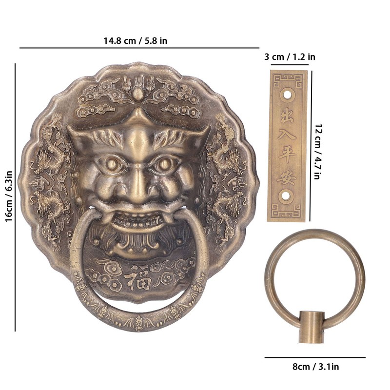 1、Brass Material: The door knocker is made of brass material, which is strong and durable, not easy to rust or fade 2、2 Sided installation: The door knocker can be installed on both sides, you can choose freely according to your preference 3、Exquisite Craftsmanship: The door knocker is well designed and crafted, ideal for decorating your home, to meet your needs 4、Heavy Duty Pull: The door knocker has heavy duty pull, simple structure, easy to use, and collision resistance 5、Scope of Application: The size of the animal head knocker is 16x14.8cm, the size of the door ring is 8cm, and the size of the gasket is 12x3cm. Suitable for double doors, wooden door courtyards, etc