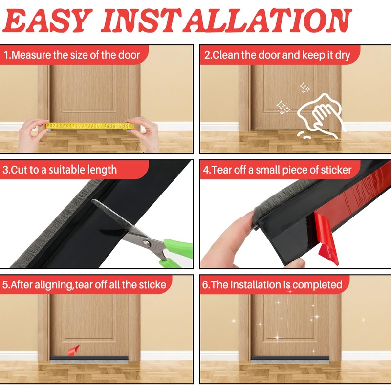 - [Door Seal Easy to Install]:This door sweep has self-adhesive super glue and integrated brush design, it is so easy to install it, just cut it to the right size according to the length of the door, then peel off the adhesive and stick it to the door,If you want to remove, the special adhesive will not damage your door.The door draft stopper can used for your front door, back door, garage entry door, bedroom door, bathroom door, you will find this under door draft stopper can use widely.