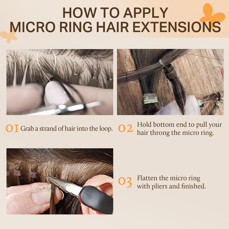 b. How to install micro link hair extensions? Take a strand of your own hair and pass it through the micro bead with a crochet hook, then use tweeter to clamp the micro bead to complete the installation.