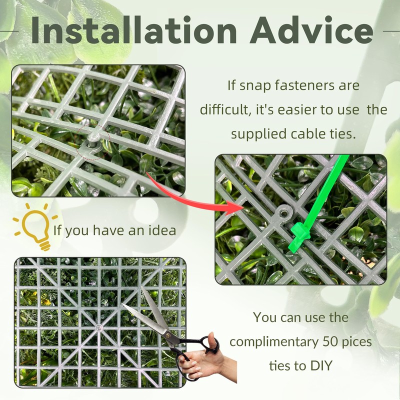 - 【Effortless setup】: The green Artificial Boxwood Hedge Panels roller blind features a permeable base. It contains 16 pieces of 20"×20 "grass wall panels, which can cover 45 square feet.Individual panels can be seamlessly connected to form a larger panel. The grass wall panel comes with 50 zipper strips, allowing for straightforward attachment to walls or fences. Each panel includes locking connectors for a hassle-free installation process. The base plate is both pliable and robust, enabling you to effortlessly trim it to your desired size using scissors or a utility knife.