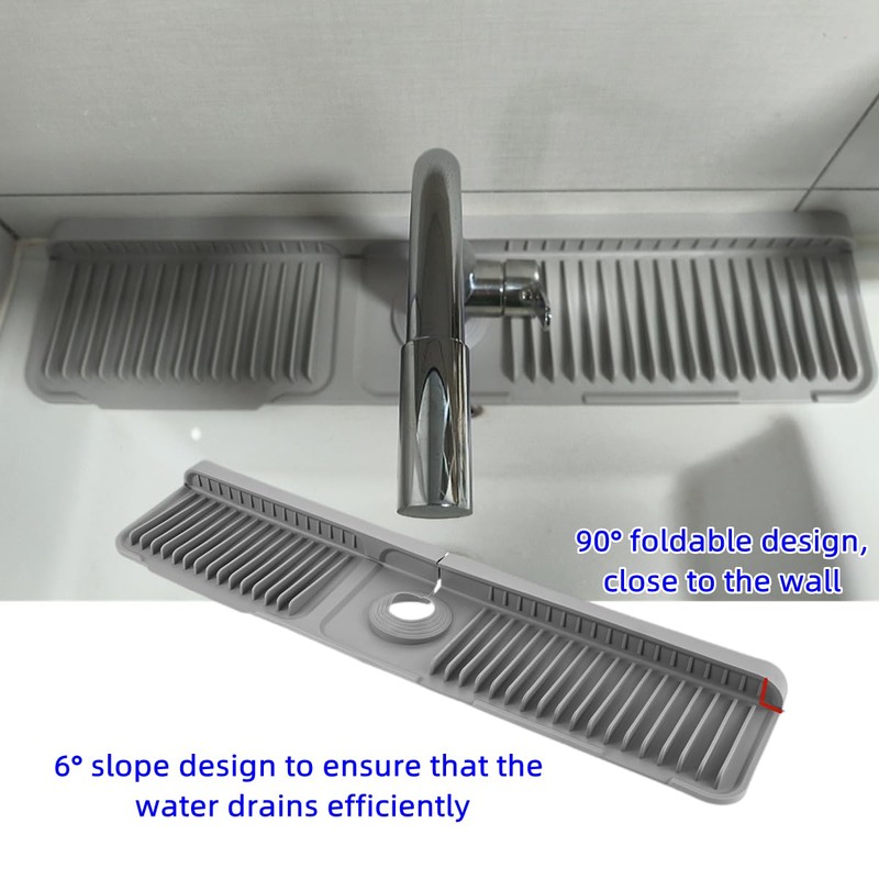 - [ 6° SLOPE DESIGN]: The bathroom sink splash guard with 6° slope design to ensure that the water drains efficiently through the mat back into the sink. The silicone splash guard mat with a fastening button to prevent water from leaking behind the mat, helping keep your kitchen dry and tidy. 90 degree foldable design to accommodate a variety of sink countertops