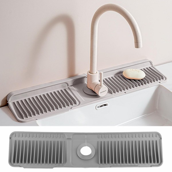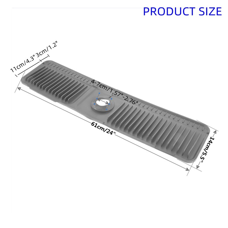 - [SIZE]: The size of the faucet draining mat is 61x14cm/24"x5.5", thickness is about 2.1cm/0.83", the center hole diameter is 40-70mm/1.57"-2.76", please ensure that there is enough countertop space around the faucet