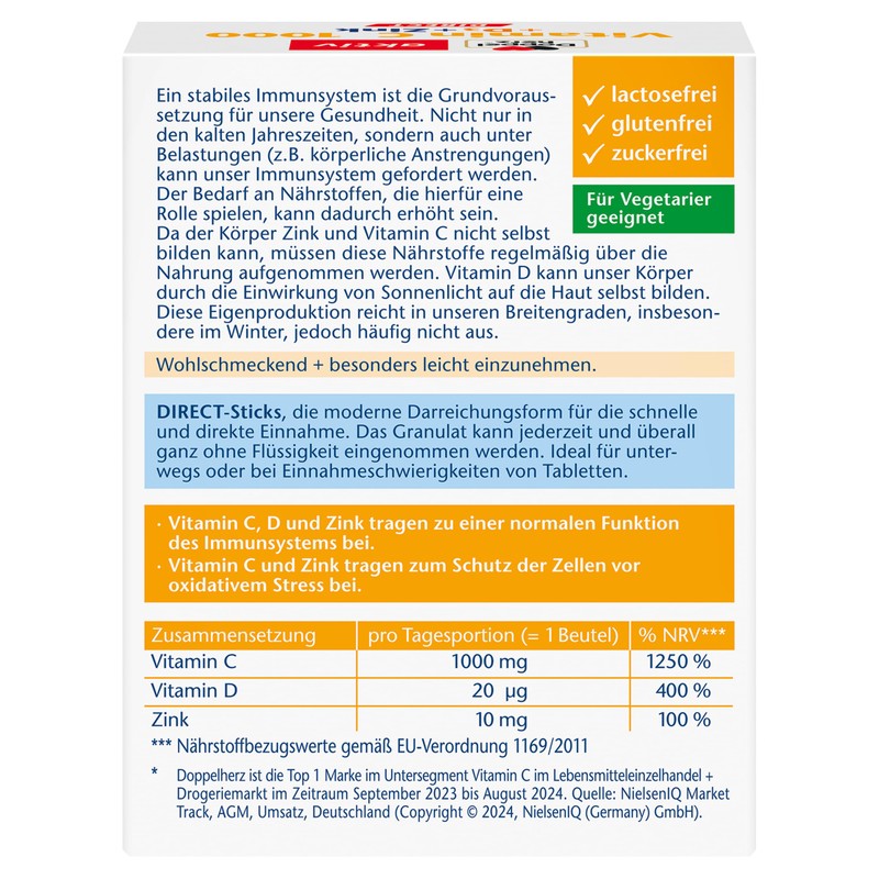- VITAMIN C, D3 und ZINK: Drei Nährstoffe in nur einem DIRECT-Stick - Vitamin C, D3 und Zink als Beitrag für die normale Funktion des Immunsystems; Granulat mit Vitamin C, Vitamin D und Zink und Blutorangen-Geschmack