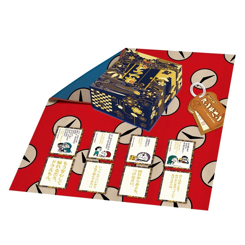 This item is an Ogura Hyakunin Isshu style game featuring quotes from Doraemon. Features: A collectible product with the charm of Doraemon is finally here! This item is an Ogura Hyakunin Isshu style game featuring quotes from Doraemon. Includes bonus item specially for this product that uses secret gadgets as the motif, making the item highly collectible! Includes well designed storage case with a Japanese design! Includes an ankipan (memory bread) style notebook so you can memorize Doraemon lines! Includes a time furoshiki play mat! The collection includes memorable quotes from the original work together with illustrations. The collection of Japanese style illustrations is also highly collectible!