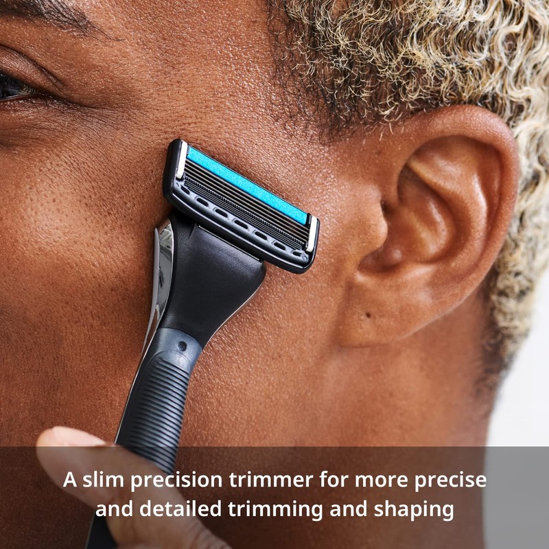 - A CLOSE, COMFORTABLE SHAVE WITH LESS IRRITATION: Advanced lubrication strip with vitamin E and aloe leaves smooth posh-shave skin. A precision trimmer on the back of the cartridge details for hard-to-reach areas such as sideburns, under the nose, or around the neck.