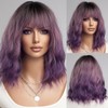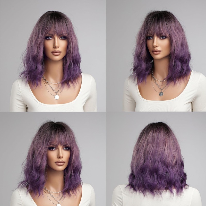 Doremiy Short Bob Ombre Black Purple Wavy Wigs for Women Natural Shoulder Length Wig with Bangs Synthetic Wigs for Daily Cosplay