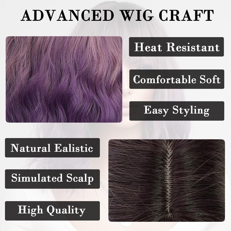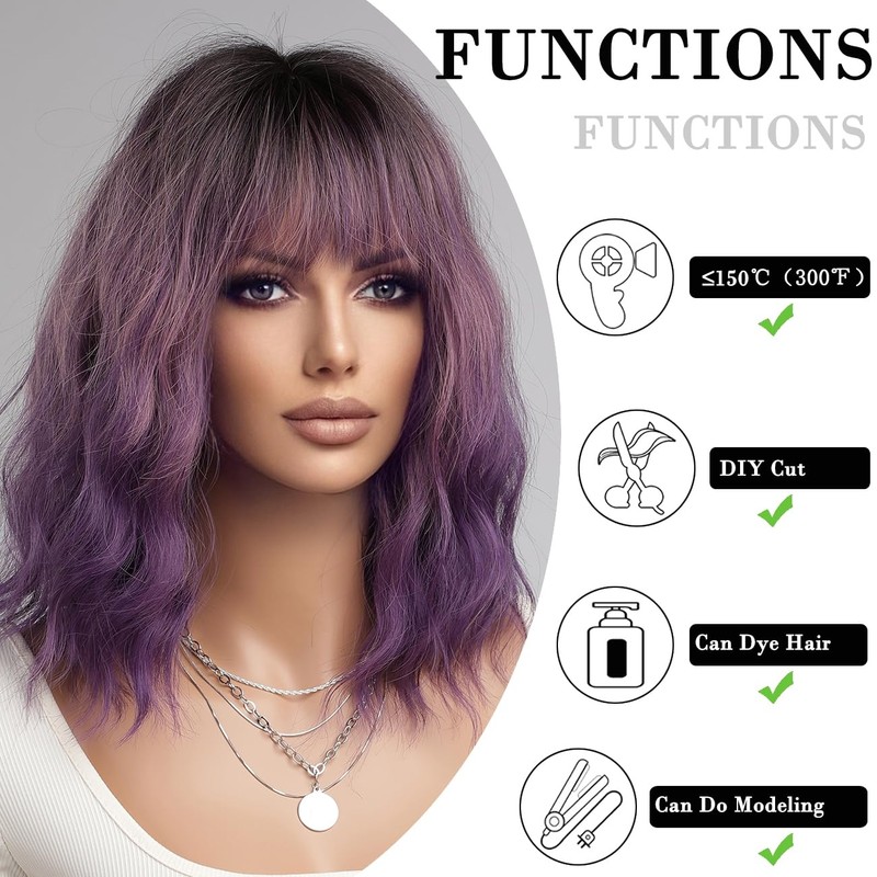- Unexpected Use:This beautiful short black purple wig with bangs can be used not only as a daily use,but also for cosplay parties,showing your confidence and beauty in minutes;Also it will bring you more surprises,you can trim the bangs or the length of the bob wig as you like;What's more,it can be dyed and permed,the temperature is controlled under 150 ℃,you will regain the stylish short wig