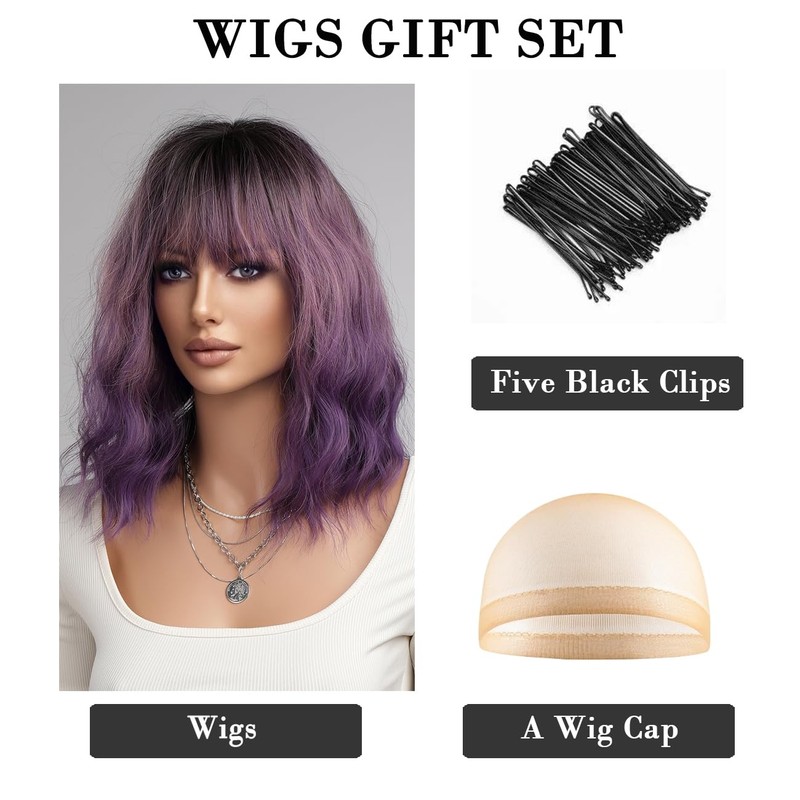 - Exquisite Women's Wig Gift:A short bob black purple wavy wig with Bangs;Wigs size :14 inches;1 pcs HD wig cap;Five small black clips