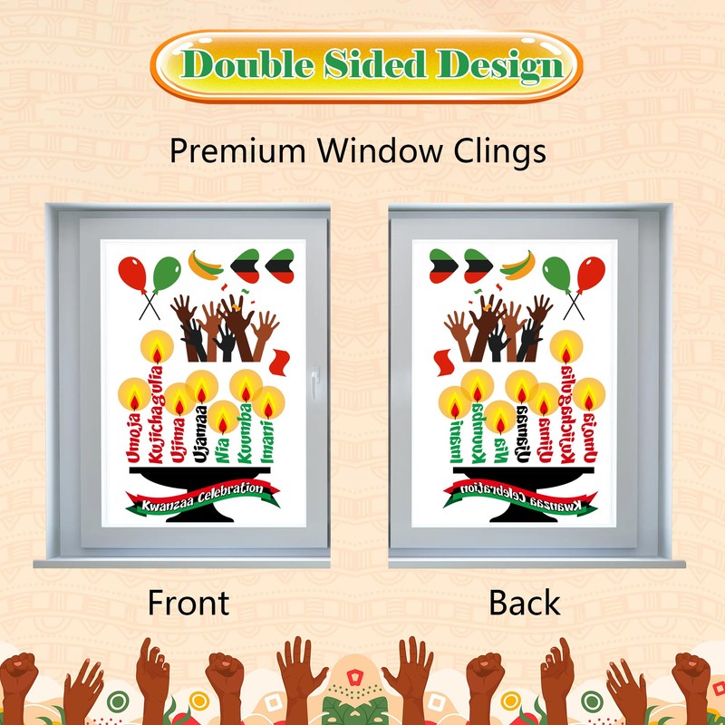 - HIGH-QUALITY: Kwanzaa window clings are made of high quality PVC, clear printing and bright colors can decorate your windows and rooms for a long time, double-sided printing, same visual effect inside and outside the window.