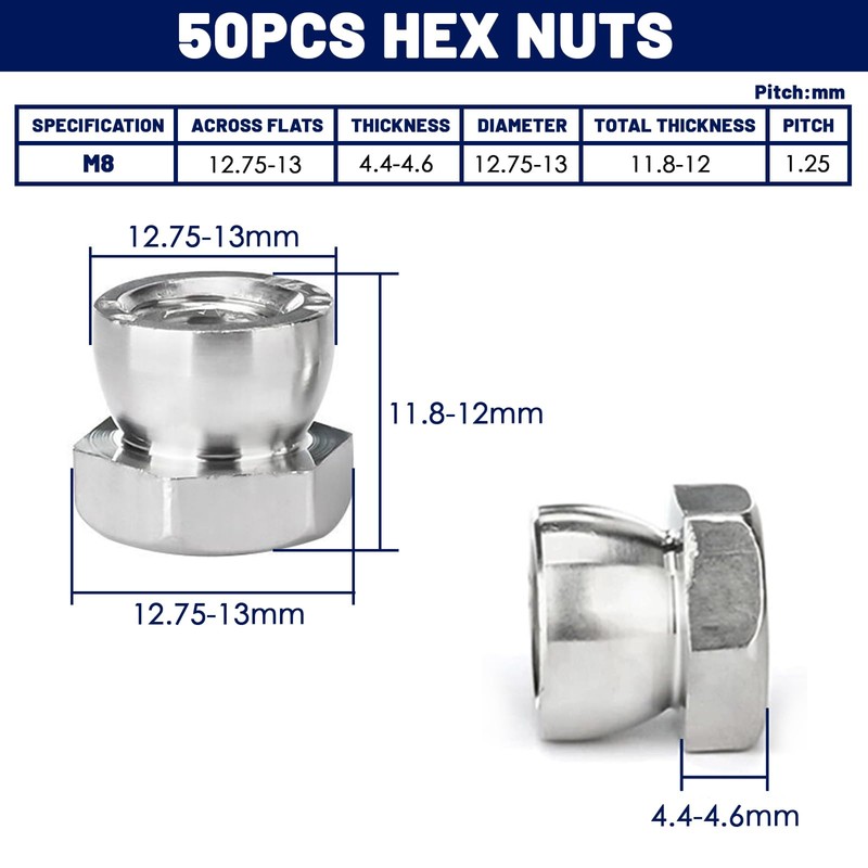 • Lock Nuts Specifications: Thread nominal:M8 Nut Head Diameter:13mm(0.51"") Thread Pitch:1.25mm(0.05"") Nut Height:12mm(0.5"") Hex Diameter:13mm(0.51""). Please refer to image 6 for detailed specifications of the Nylon Insert Nuts.