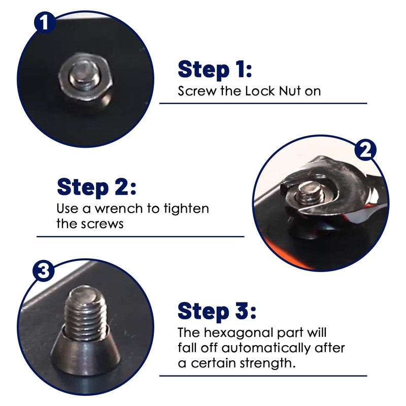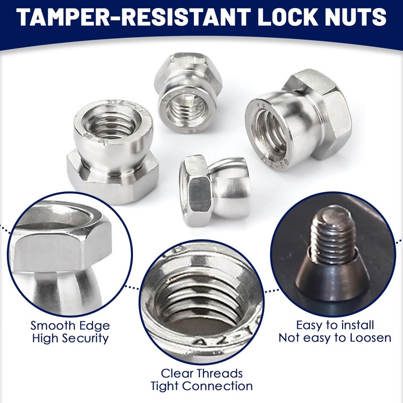 • Widely Used: Hex Lock Nuts strength screwed to a certain strength, the hexagonal part will fall off, the Nuts will not be able to be unscrewed again, so as to play the role of anti-theft. Mainly used for outdoor facilities of anti-theft, such as garden decoration, outdoor chairs, patio tents, etc