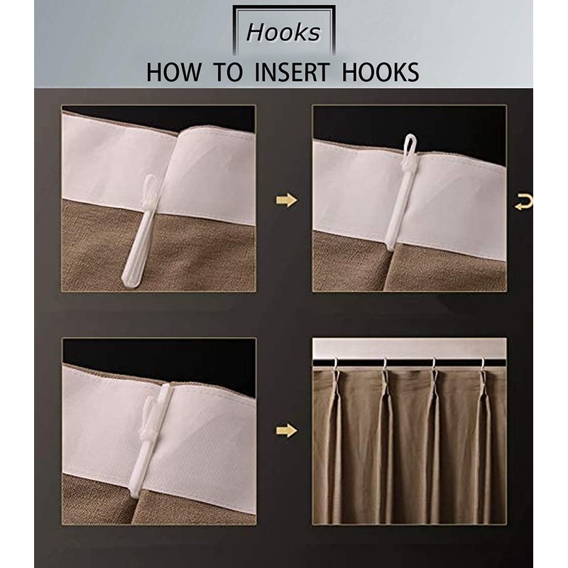 - Come with adjustable pin hooks. Pleats pin hooks quantity: 9 pleats for 50" width; 13 pleats for 72" width; 15 pleats for 84" width; 19 pleats for 100" width; 21 pleats for 110" width, 23 pleats for 120" width, 29 for 150" width, 35 for 180" width and 37 for 200" width.