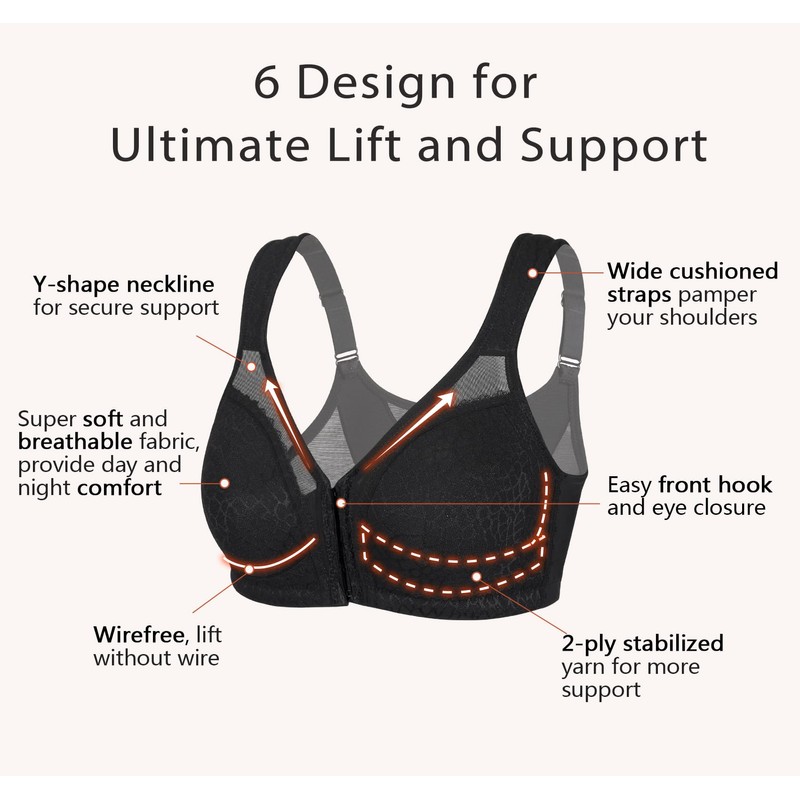 - Front Closure Bra: The full-coverage bra's front closure design with reinforced hooks ensures comfortable wear—perfect for post-surgery recovery or fuller busts. Easily put it on, even with limited mobility, freeing your hands from the struggle