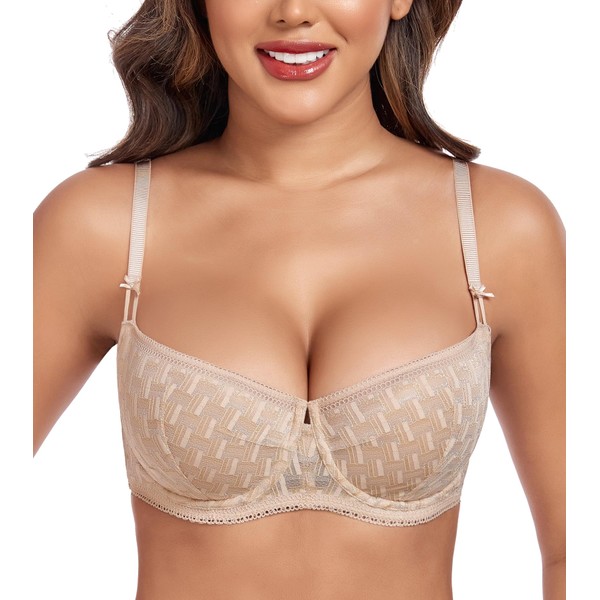 DotVol Women's Lace Sheer Balconette See Through Unlined Underwire Everyday Bra(Beige,38DD)