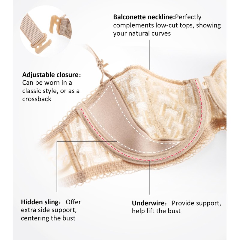- Balconette Style: Unlined 1/2 cups with see through lace create a sexy look, making it perfect for low-cut tops.