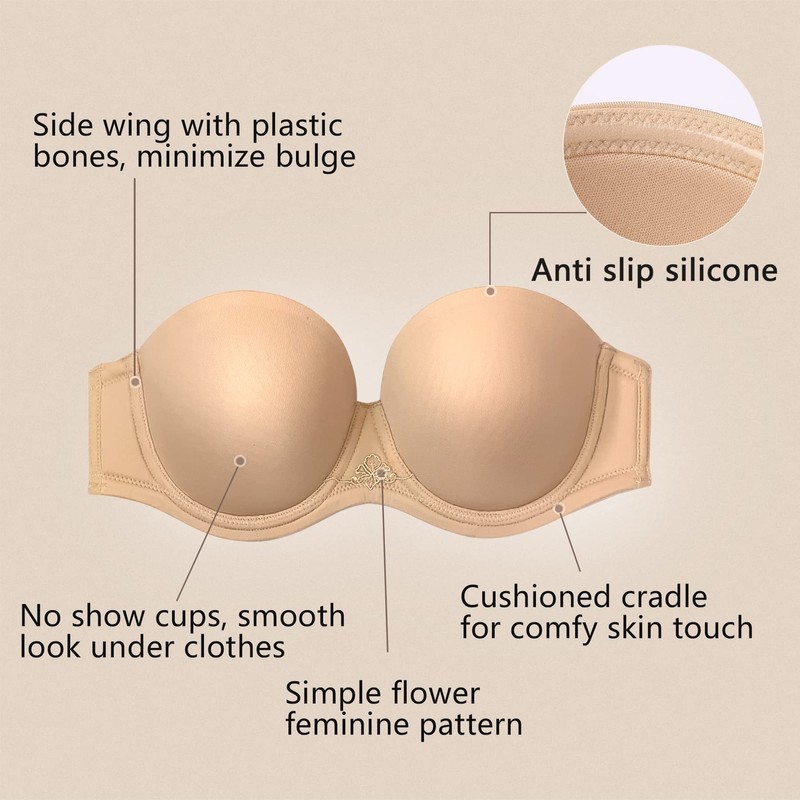 - Package content: strapless bra + gift(a pair of original detachable straps). DO NOT bleach or iron, tumble dry or dry clean. Material: 92% Polyamide 8% Spandex, Wing: 88% Polyamide 12% Spandex.