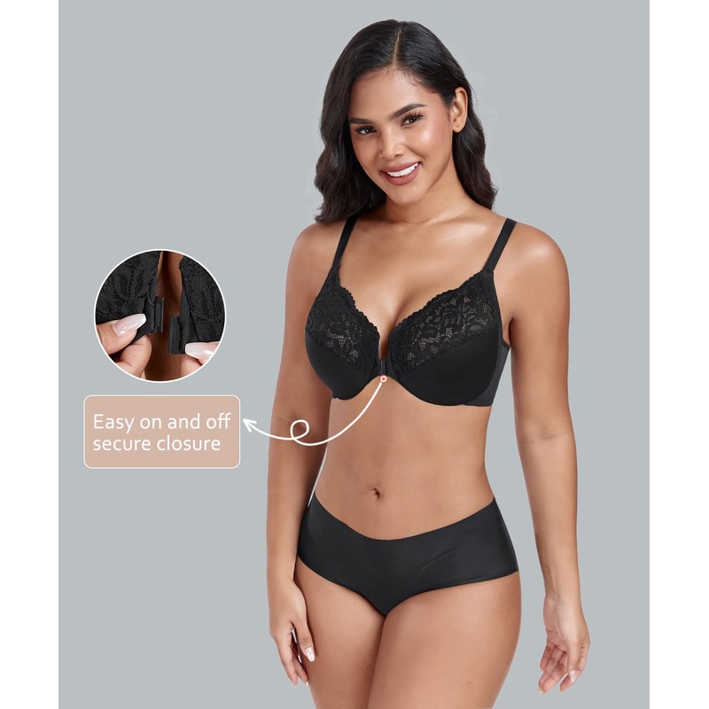 DotVol Women's Plus Size Front Closure Flower Lace T-Back Underwire Everyday ...
