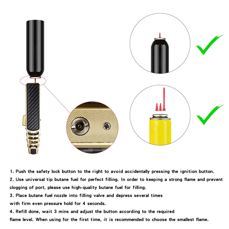 - REFILLABLE AND ADJUSTABLE FLAME: The butane torch lighter can refill butane when out of gas, and you can turn the fuel adjustment wheel on the side of the lighter towards the (+) mark to increase the flame, turn the wheel towards the (-) to decrease the flame to achieve a desired height. With a safety lock, the cigar lighter can prevent accidental ignition and misused by children.(Butane Gas Not Included due to shipping regulations)