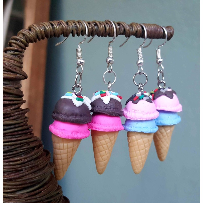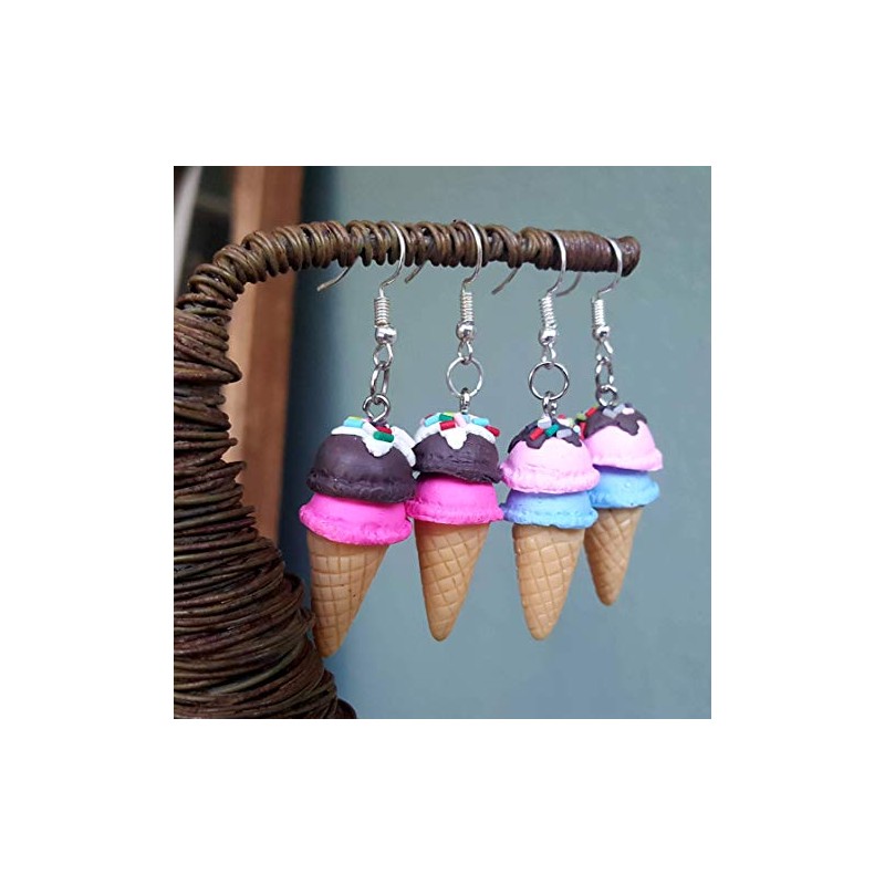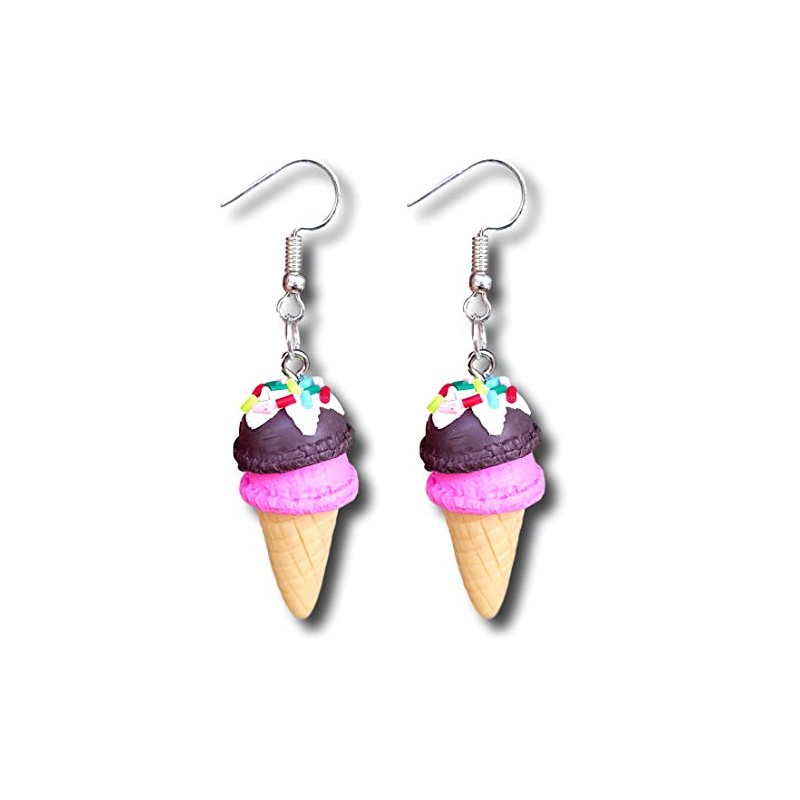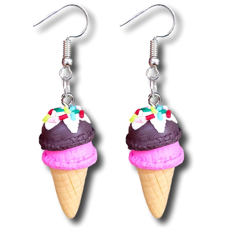 Double 3D Ice Cream Kawaii Cone with Sprinkles Dangle Drop Earrings (Chocolate & Pink)
