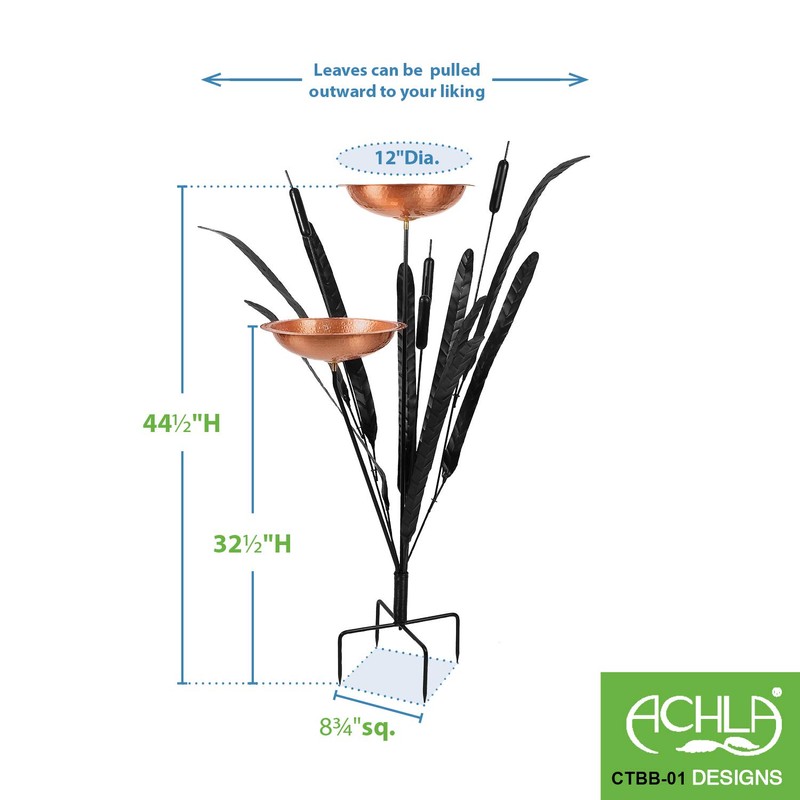• EASY TO ASSEMBLE: No tools required! Simply thread the spiked foot to the bottom of the main stem and the copper bowl to the top. Spike directly into the ground and fan the cattails and leaves as desired. Cattail Birdbath have multi-pronged ground stakes for increased stability.