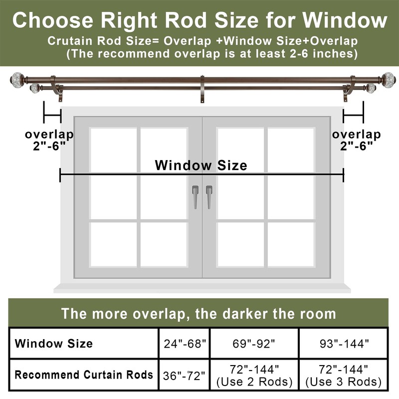 - READ BEFORE ORDER: How to Select Right Rod Size: To achieve better shading, when installing the curtain rod, we need to leave a 2-6 inch overlap on both sides of the window. So if your window width is in the range of 24-68 inches, please choose 36”-72” rod; if window width is between 69-140 inches, please choose 72”-144” rod