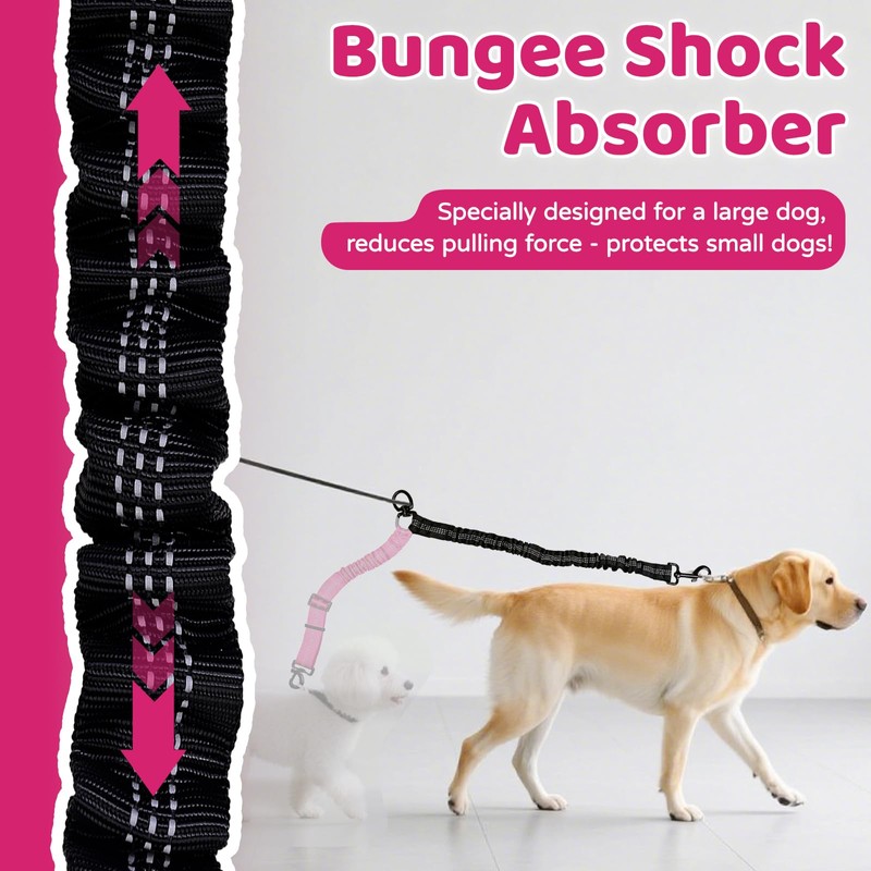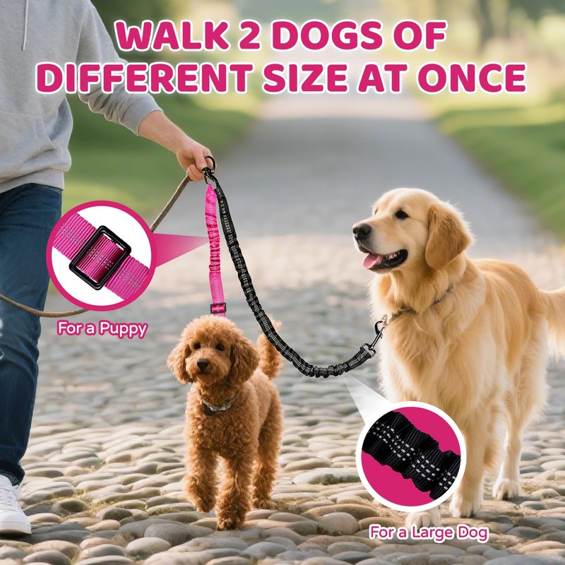 Double Dog Leash Coupler-360° Swivel, No Tangle Dual Walking Leash Attachment with Adjustable Strap & Reflective Shock Absorbing Bungee, Split Lead for Two Different Size Dogs