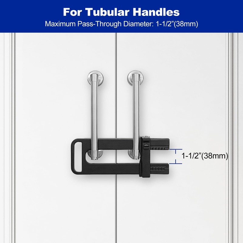 - U-Bracket Design: The 1-1/2" opening accommodates the neck of most double-door knobs/levers for secure locking. Also compatible with tubular handles under 1-1/2" diameter, including: barn doors, gate, double-door refrigerators.