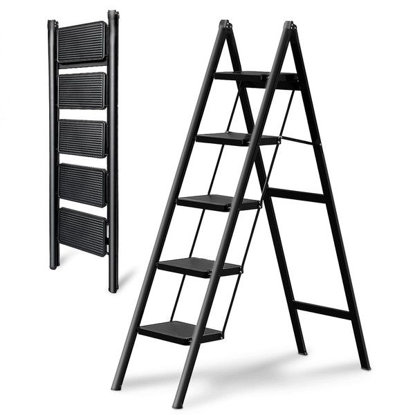 - 【Multi-Purpose Home Essential】Beyond as a traditional ladder tool, this 5-step folding step stool serves as a decorative plant stand, temporary bookshelf, or kitchen helper for cabinet access. The matte black finish ladder matches modern home décor aesthetics, while the wide-top platform doubles as a stable workstation for DIY projects.