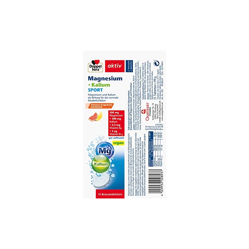 - Box contents: 1 pack of 15 effervescent tablets Doppelherz magnesium + potassium, for the muscles and energy metabolism, vegan, gluten-free and lactose-free
