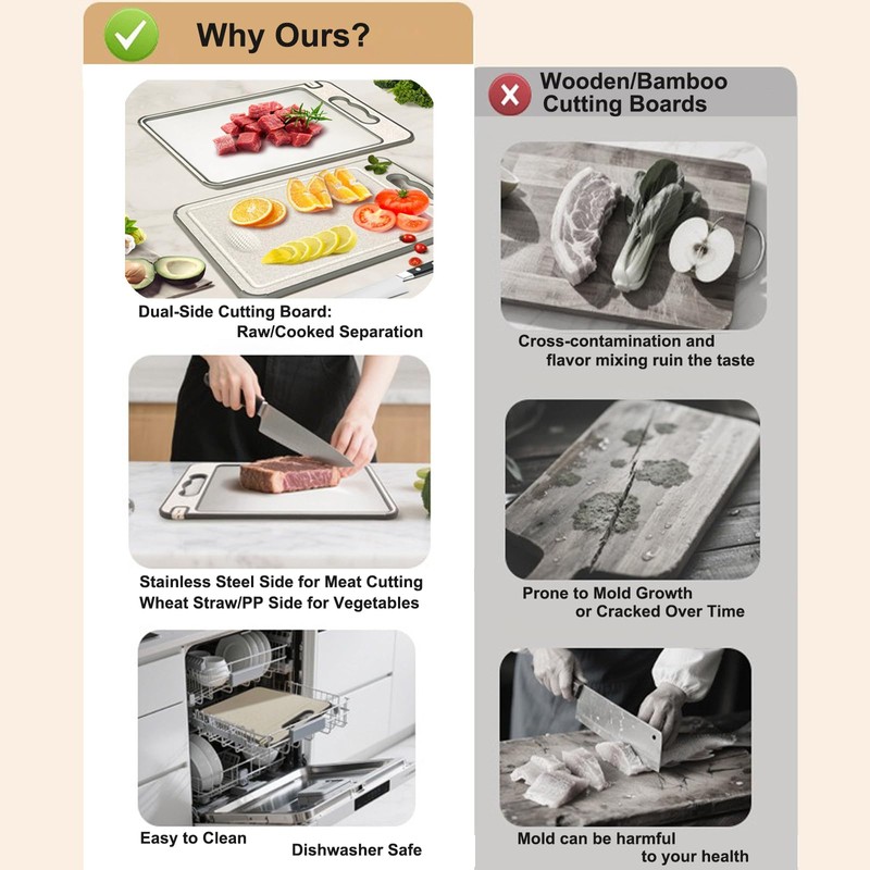 - Dual-Sided Cutting for Versatile Use: The Ytuomzi cutting board features 304 stainless steel on one side and food-grade PP wheat straw fiber on the other, ensuring durability and safety. This dual-sided cutting board is BPA-free, making it safe for direct food contact. Perfect for slicing meats or chopping fruits and vegetables, its sturdy construction resists wear and tear, providing a reliable, long-lasting solution for all your kitchen tasks.