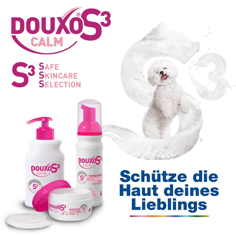 - DOUXO S3 Calm Pads can help soothe sensitive, itchy or irritated skin and can help balance the skin and strengthen the skin barrier. Ideal for the care of all sensitive or hard-to-reach areas of the body, e.g. ear cup and outer ear canal, chin, paw gaps, lip and skin wrinkles as well as for removing tear and saliva residue.