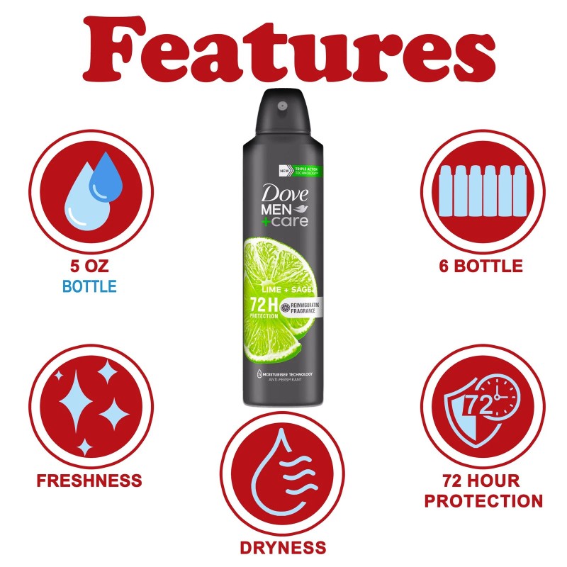 - VALUE PACK OF 6: Comes in a Pack of 6 Dove Men+Care Lime + Sage Antiperspirant Sprays, giving you long-lasting freshness and reliable sweat protection at home, work, or in your gym bag.