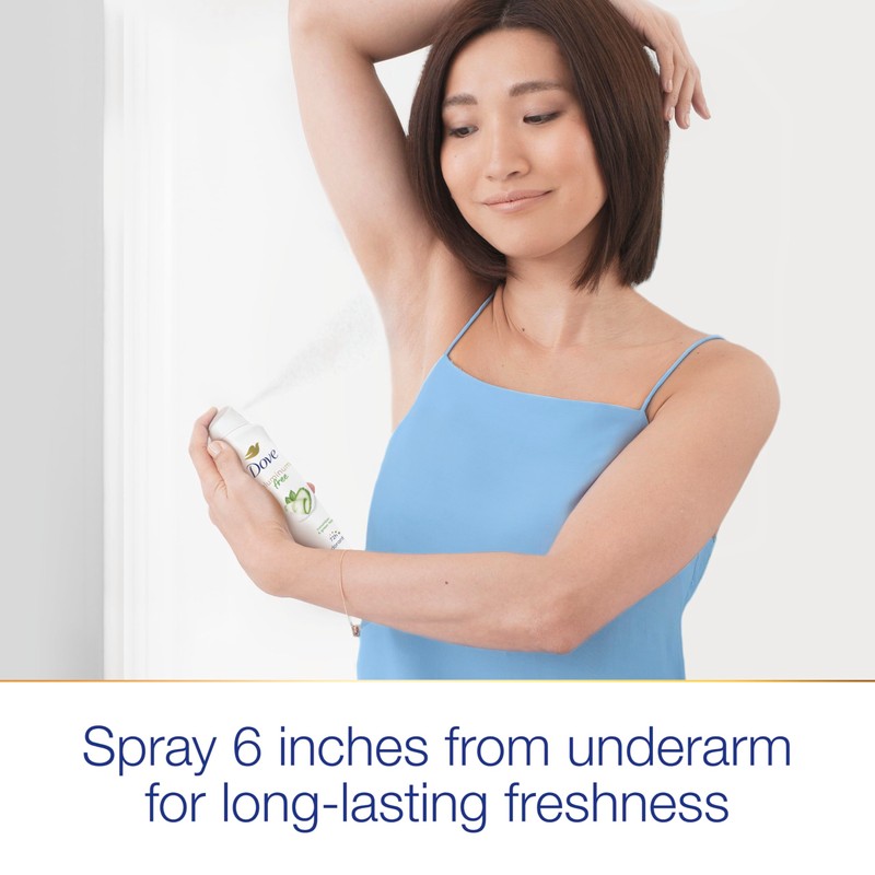 Your delicate underarm skin deserves the same care you give the rest of your body. Dove 0% Aluminum Deodorant Spray with Cucumber and Green Tea gives long-lasting freshness, gentle underarm care, and superior odor protection day and night. When you spray your deodorant, you want freshness that lasts. This 48-hour deodorant for women protects against odor no matter what the day brings C one spray is enough to keep the worry of odor away. Thats not all C enriched with ? moisturizers, this aluminum free deodorant spray also cares for your skin while it protects against odor. Reliable long-lasting freshness will leave you feeling confident and clean C all day long. Infused with cucumber and green tea scent, this aluminum-free deodorant spray gives superior 48h odor protection with every application. To apply your aluminum-free spray deodorant, hold the can six inches from your underarm and spray for long-lasting freshness and 48-hour odor protection. For the most effective underarm care, avoid applying directly after shaving. If youre looking for all-day freshness, dont forget to give your underarms a quick spray each morning. With effective odor protection, the fresh scent of this deodorant without aluminum will leave you feeling fresher for longer. Dove believes that no young person should be held back from reaching their full potential. Since 2004, Dove has been building self-esteem in young people C and by 2030, theyll have helped ? billion through our educational programs.