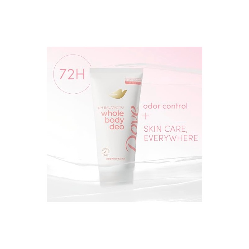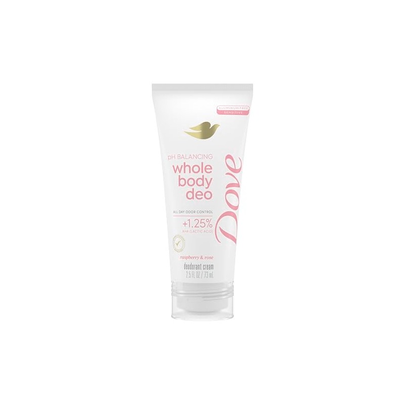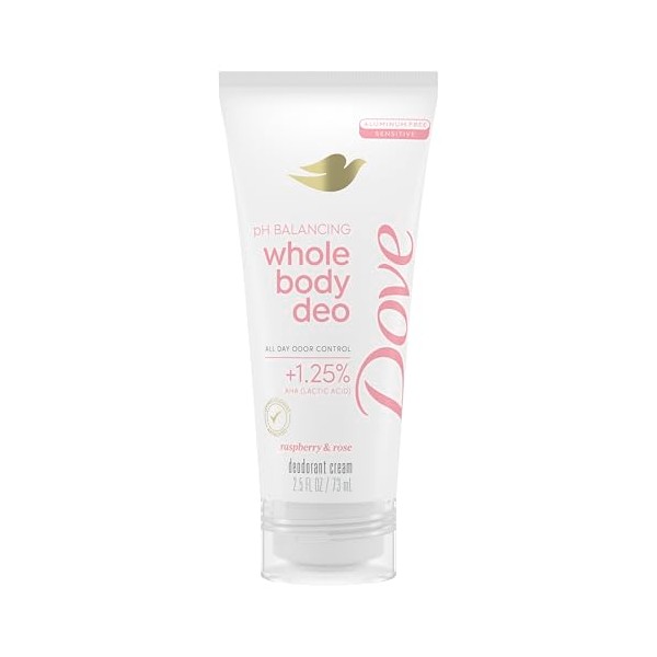 Dreaming of a deodorant that gives you long-lasting odor protection and cares for your skin? We've got just the thing. Dove Whole Body Deo Raspberry & Rose Deodorant Cream is an invisible deodorant that delivers 72-hour body odor control and is infused with skin-loving ingredients. Whether it's because of hot commutes into the city or your weekly high-energy spin class, sweat and odor happen - and not just on our underarms. That's why our non-irritating deodorant cream has your back (and pits, privates, thighs and toes) C to help you feel fresh and confident, all day. This gentle on skin, tough on odor formula, powered by 1.25% lactic acid, balances skin pH and helps stop odor before it starts. It's also dermatologist and gynecologist-approved, designed for sensitive skin, and free from aluminum and parabens. And with its fruity, floral raspberry and rose scent, Dove Whole Body Deo transports you to a summer garden every time you apply it. We're proud to say that globally, Dove does not test on animals and this whole body deodorant cream is PETA-Approved Vegan. For external use only
