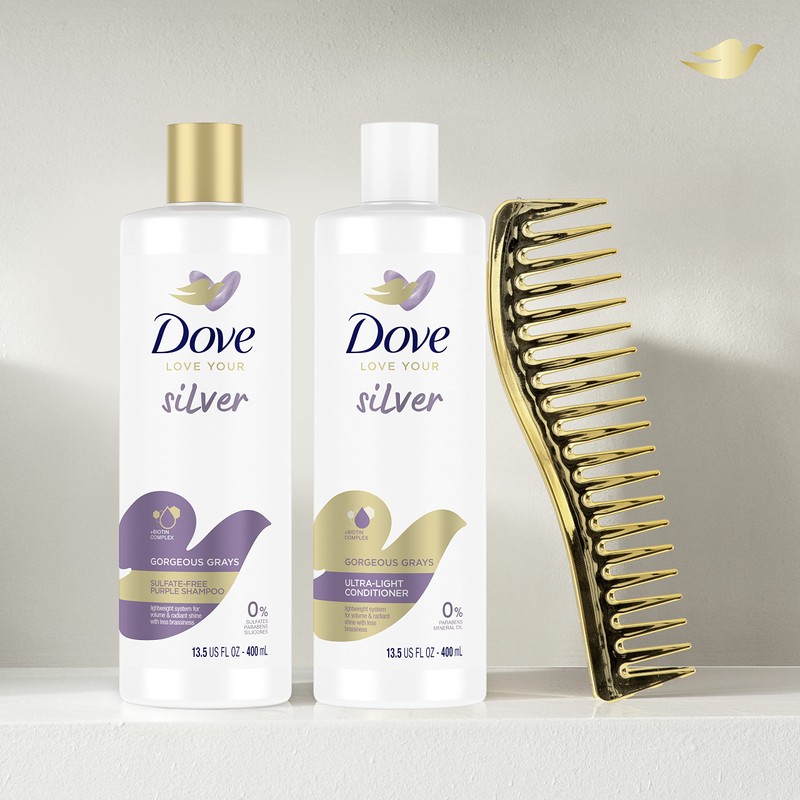 - Dove Love Your Silver Gorgeous Grays Shampoo uses purple pigment to counteract unwanted tones, combat brassiness, and add radiant shine to hair