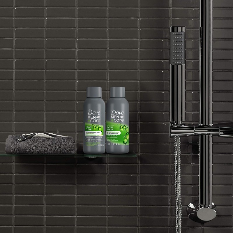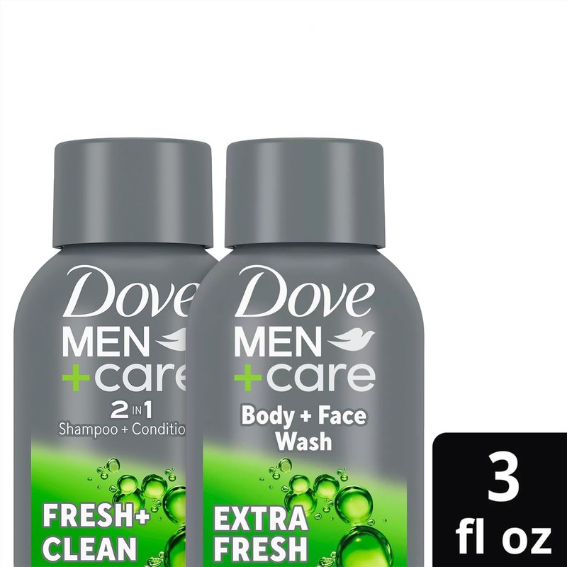 - DOVE MEN SHOWER ESSENTIALS: This travel toiletries bundle for men includes a Dove Extra Fresh Face & Body Wash and a 2-in-1 Shampoo and Conditioner C for complete personal care while on the go.