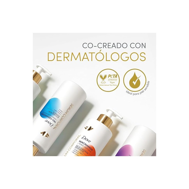 Vuelve a sentir tu piel suave y humectada con el Sérum Corporal Dove Hialurónico + Dermo Renovador que trabaja con tu piel para humectarla profundamente y prevenir 5 signos de resequedad, dándole 48 horas de humectación, gracias a que contiene una fórmula para el cuidado de la piel enriquecida con colágeno vegano**, que ayuda a promover la firmeza, soporte y resistencia de la piel, pro-lípidos, que ayudan a restaurar la barrera dérmica previniendo la resequedad, y niacinamida, que ayuda a fortalecer la barrera cutánea y estimula la renovación celular para que tu piel vuelva sentirse sedosa e hidratada. Dale a la piel de tu cuerpo el mismo cuidado que a la piel de tu cara con los sérums corporales de Dove, co-creados con dermatólogos usando fórmulas intensivas, de fácil aplicación, clínicamente probadas y enriquecidas con ingredientes que se absorben rápidamente y fórmulas de uso diario con una alta capacidad de penetración que aportan nutrientes y activos a las capas profundas de la piel*, actuando de adentro hacia afuera* para dejar tu piel radiante y tan suave como Dove. En Dove nos preocupamos por tu piel y por el planeta. Desde hace más de 25 años estamos comprometidos a brindarte la protección y el cuidado que necesitas sin dejar de cuidar el medio ambiente. Únete a nosotros en nuestro compromiso por reducir el desperdicio y preservar nuestros recursos. Cada elección cuenta. Juntos, podemos proteger nuestra piel y el mundo que amamos. Cuidemos de ti y del planeta con Dove. *Estrato córneo. **SH-Polypeptide-121.