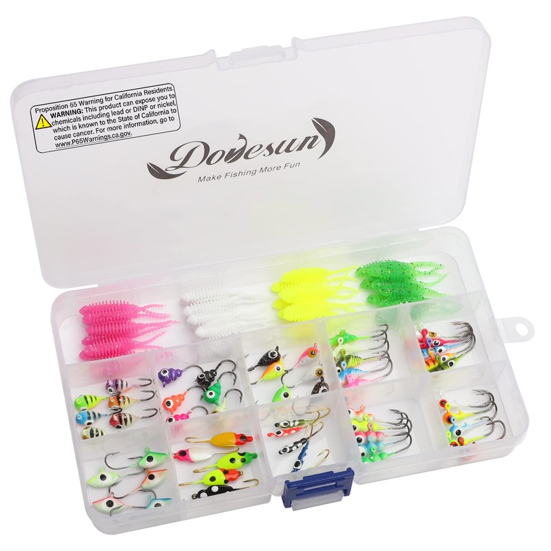 - 【93Pcs Ice Fishing Kit】: Dovesun ice fishing kit include 10 different kinds of shapes ice fishing lure, seven size: 1/14oz, 1/15oz, 1/16oz, 1/18oz, 1/25oz, 1/36oz,1/56oz. There are 53pcs ice fishing jigs hook, including 17pcs glow-in-the-dark hooks. And 40pcs glow-in-the-dark soft plastic fishing lures. If glow in the dark lures can prove their worth, it’s during ice fishing season. The little bit of glowing flare can entice bites that can make for a good day on the ice.