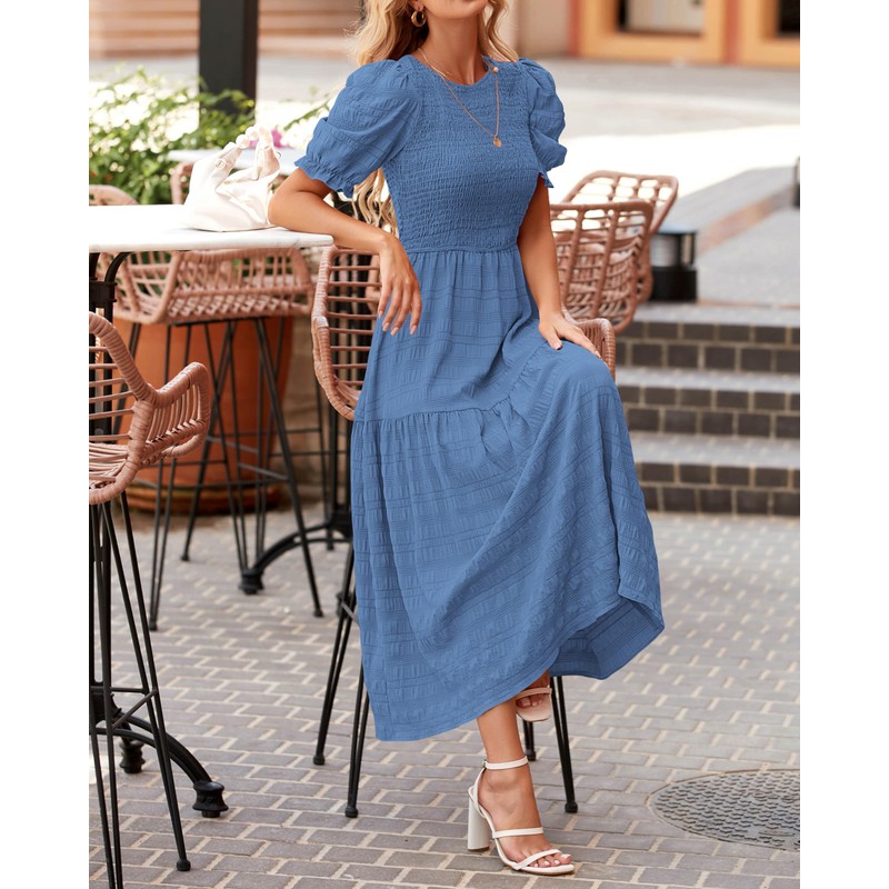 dowerme Womens Summer Dresses 2025 Casual Puff Short Sleeve Crewneck Smocked Flowy Ruffle Boho Beach Party Maxi Sundress(Grey Blue,Small)