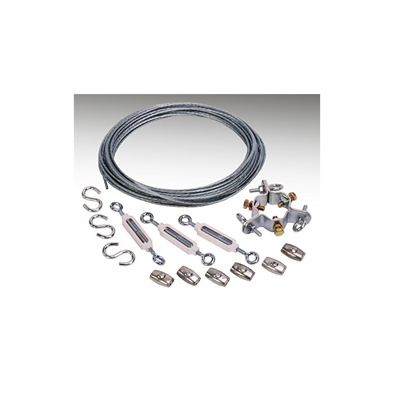 - INCLUDES: 50' 6/20 PLASTIC-COATED GUY WIRE, GUY WIRE RING, 3 S HOOKS, 3 TURNBUCKLES, 6 TILLER CLAMPS