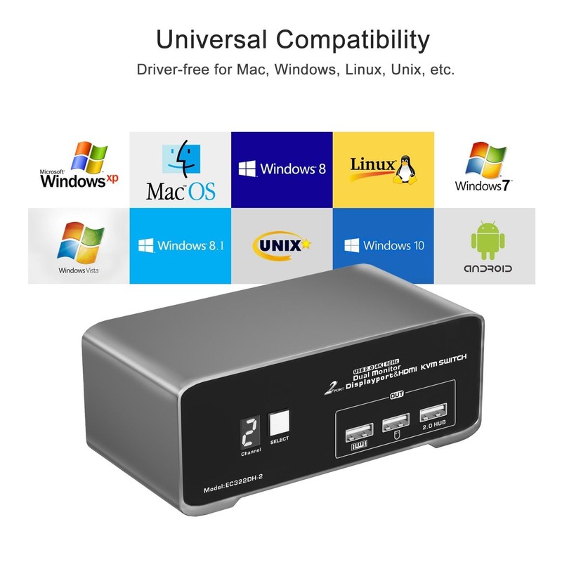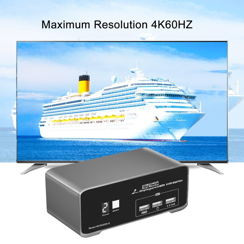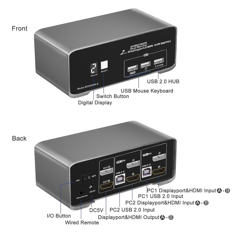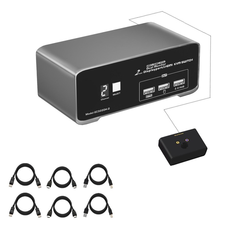 - DP HDMI KVM Switch 2 Port - The 2-Port DP HDMI KVM Switch enables two HDMI&DP -equipped PCs to share 2 monitors (DP + HDMI), a keyboard, and mouse, facilitating effortless switching between systems. It helps declutter your workspace and maintain a neat, organized environment.