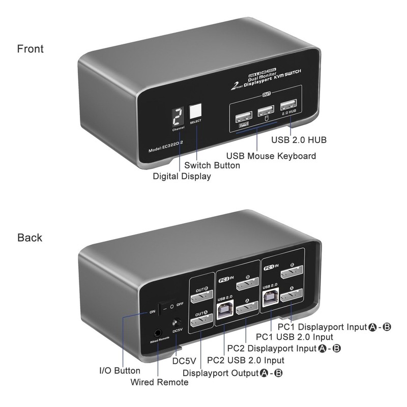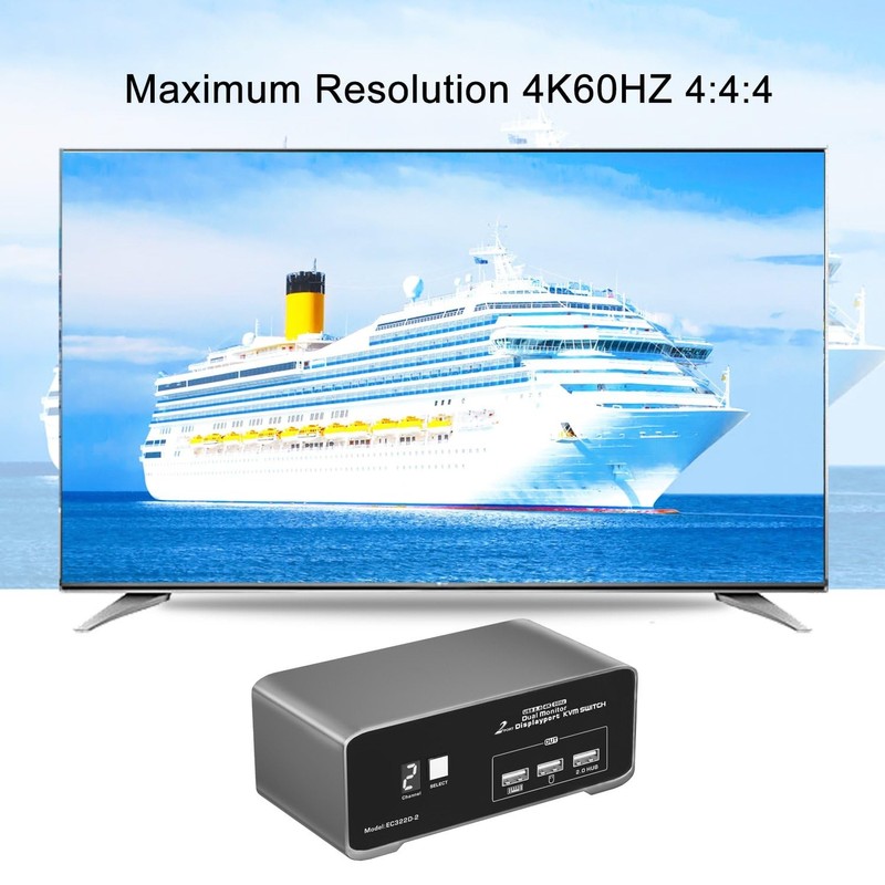 - DP KVM Switch 2 Port - The 2-Port DP KVM Switch enables two DP-equipped PCs to share 2 DP monitors, a keyboard, and mouse, facilitating effortless switching between systems. It helps declutter your workspace and maintain a neat, organized environment.